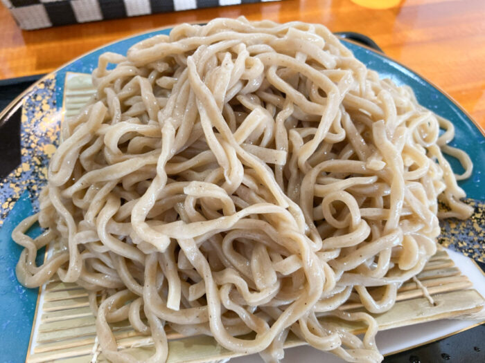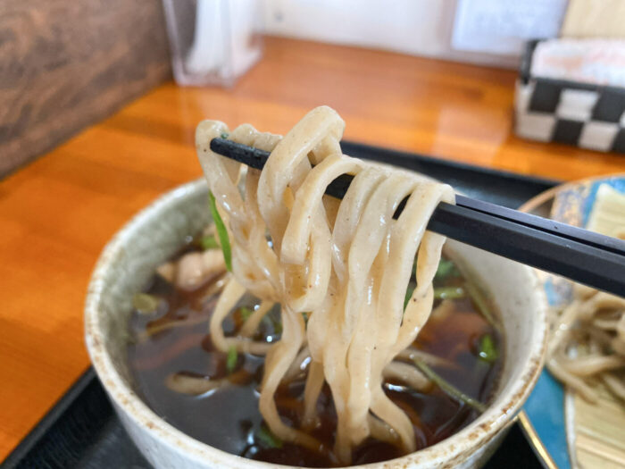 確かに蕎麦粉の色味がしていますが、中華麺のようなプリッとしたコシも感じますね。