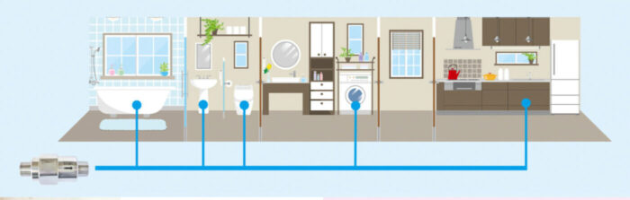 「ウルトラファインバブル生成装置」を配水管に直接取り付けることで、キッチン、トイレ、お風呂、洗濯、洗面所等、自宅の水が全てウルトラファインバブルの水になります。