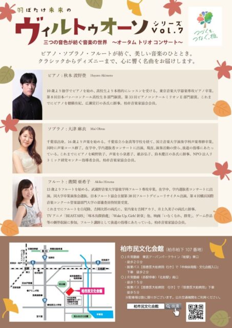 羽ばたけ未来のヴィルトゥオーソ シリーズVol.7・11/15(土)柏市民文化会館で三つの音色が織りなすオータムトリオコンサート