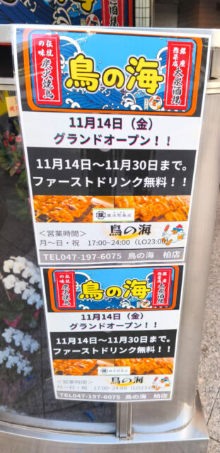 柏駅南口近くに焼き鳥大衆酒場「鳥の海 柏店」が11/14(金)からオープンしています。