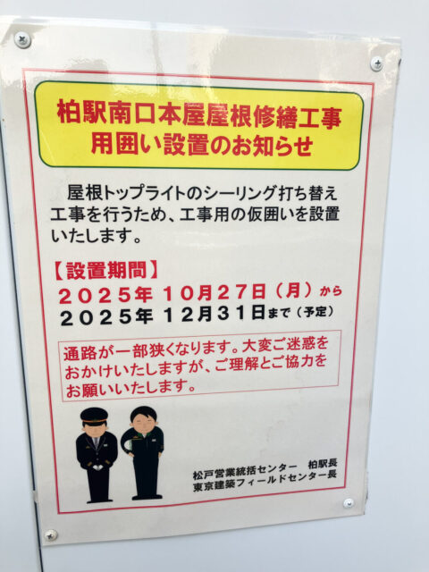 駅構内に掲示された工事のお知らせによると、屋根トップライトのシーリング打ち替え工事のため、10月27日(月)から12月31日までの約2ヶ月間、工事用の仮囲いが設置されています。