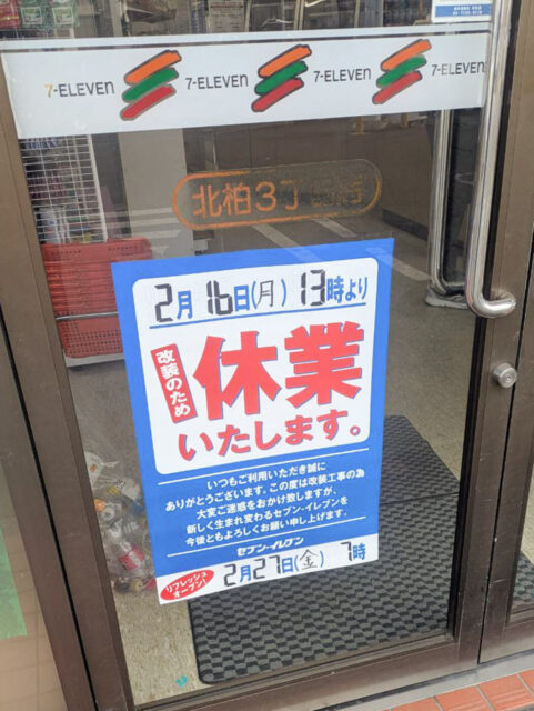 北柏駅南口方面「セブンイレブン 北柏3丁目店」が2/16(月)13時から休業、2/27(金)7時リフレッシュオープン予定