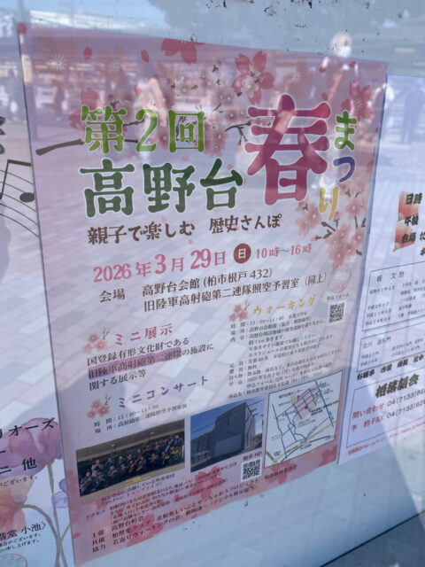 柏市根戸の高野台会館・旧陸軍高射砲第二連隊照空予習室にて、2026年3月29日(日)に「高野台春まつり~親子で楽しむ 歴史さんぽ~」が開催されます。国登録有形文化財「旧陸軍高射砲第二連隊 照空予習室」のパネル展示や吹奏楽団の演奏など地域で楽しめるイベントです。