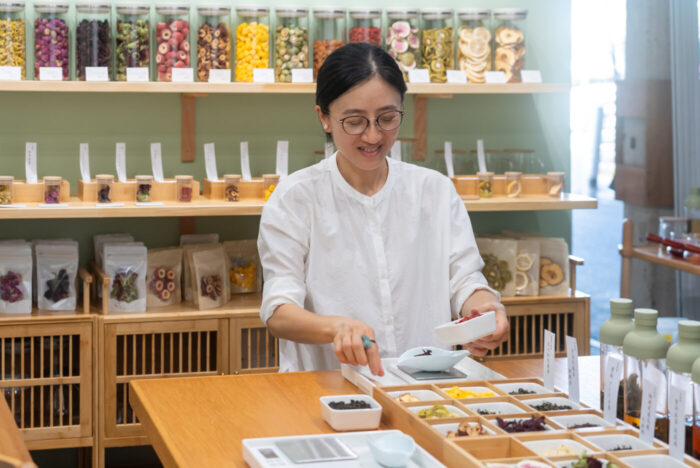 また、人気商品「ばら花冠茶®」「ジャスミン花茶」「金木犀花茶」と、鉄観音・烏龍茶・和紅茶などの茶葉を組み合わせた「ブレンドティー」シリーズも取り揃えています。