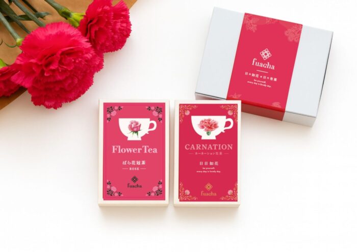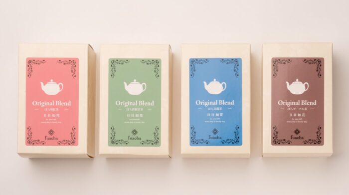 fuachaの定番商品「ばら花冠茶®」をはじめ、「ジャスミン花茶」「金木犀花茶」「菊花茶」の花茶4種と果茶も取り揃えています。