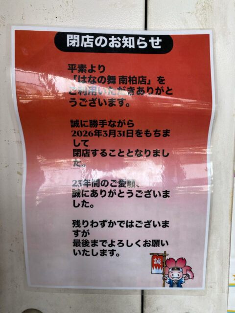 南柏駅西口直結の居酒屋チェーン「はなの舞 南柏店」が3/31(日)をもって閉店